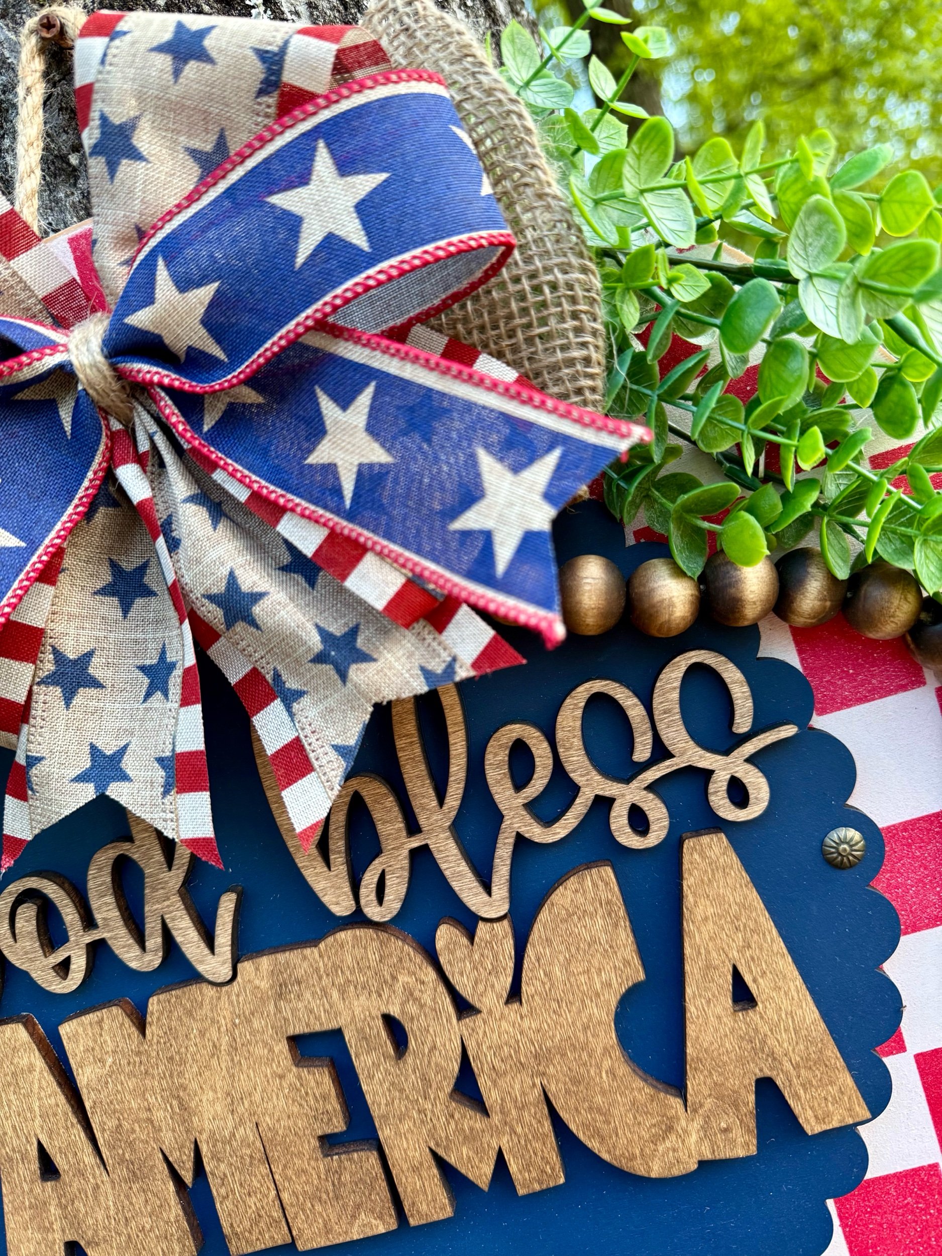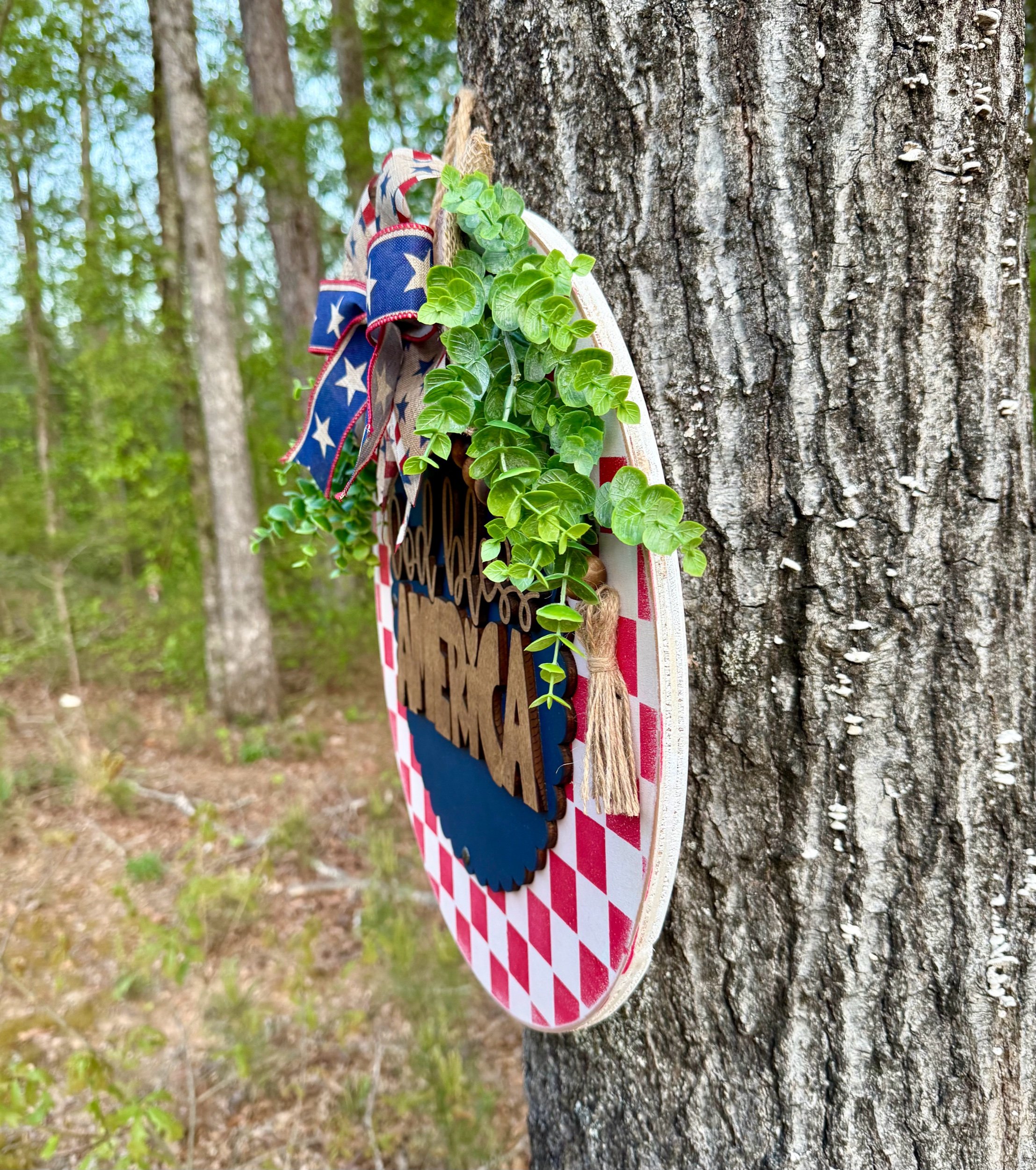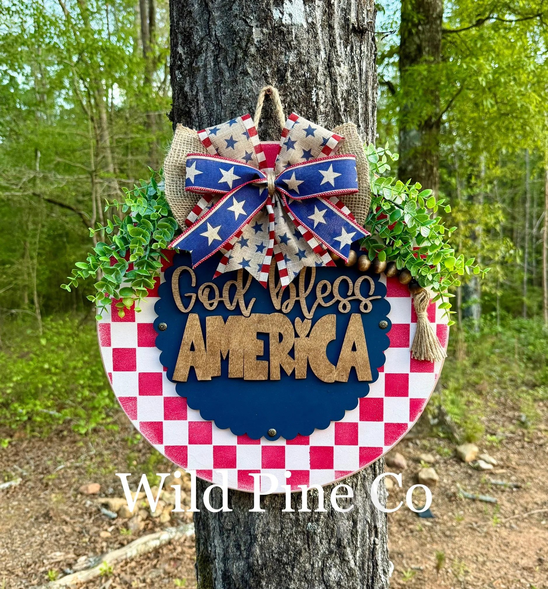Beautiful red, white and blue checkered God bless America hanger. 18” in diameter and 1/2" thick. Hand painted with 1/4” wood lettering and sealed against weathering.